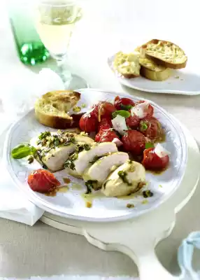 Meanwhile roasting ciabatta in the toaster. Slice the parmesan into fine shavings with a peeler. Pluck off the remaining basil leaves. Chop large leaves, leave small leaves whole. Arrange chicken filets and tomatoes.