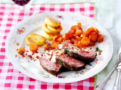 Whip the cream until semi-stiff. Heat lemon butter and add cream. Mix everything with the hand blender briefly. Take the meat out of the oven. Brown the meat in the pan again briefly on all sides, roll in the herb mix.