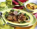 Season to taste with pepper and coriander. Cut the meat into slices. Arrange with the vegetables on a preheated plate. Garnish with a basil bouquet. Serve with small potato rosettes or croquettes au gratin.