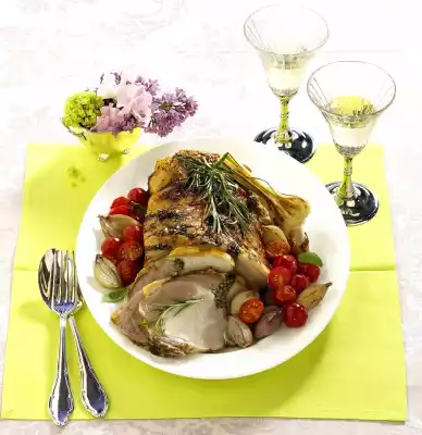 Tie together with kitchen string to a roll roast. Rinse the fat pan of the oven with water. Place roast on top. Roast in the preheated oven (electric cooker: 200 °C/ convection oven: 175 °C/ gas: level 3) for 1 1/2-1 3/4 hours.