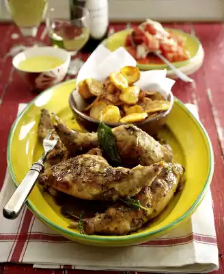 Remove the finished potatoes, drain the oil well and season the potato slices with salt. Remove the rabbit from the sauce. Pour the sauce through a sieve. Arrange rabbit, sauce, potatoes, aioli and garnish with thyme.