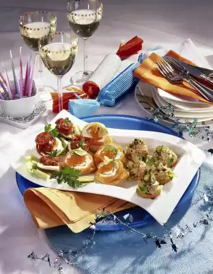 Lift the fillets carefully out of the tin and divide them into about 10 pieces. Drain eggs, quench, peel and slice. Cover each slice of pumpernickel with a slice of egg, fillet, tomato and/or bacon. Serve garnished with parsley as desired