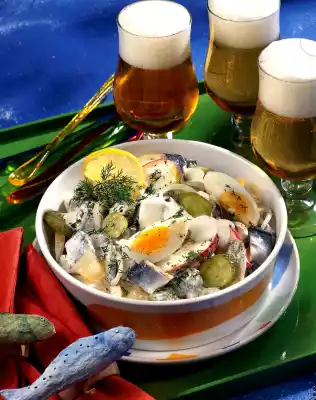 Cut the herring into pieces. Wash the dill, dab dry, cut finely and stir into the yoghurt cream. Cut the eggs into slices. Carefully mix onions, gherkins, gherkins, apple slices, Bismarck herring and eggs.