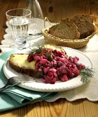Wash the beetroot and cook for about 45 minutes in boiling salted water. Meanwhile peel, wash and dice the potatoes and celery and cook in boiling salted water for about 10 minutes. Boil the eggs hard for 10 minutes. Peel and finely dice onions. Also dice gherkins and matie filets.