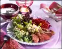 Mix sour cream and salad cream. Season to taste with salt, pepper, vinegar and sugar. Add capers. Drain the beetroot, quench and let it cool down a bit. Then peel the skin off the beetroot (caution: it colours very strongly, wear gloves if necessary) and dice the beetroot. Quench the eggs with cold water, peel and chop them. Mix all ingredients together and season again. Wash the dill and shake dry. Pluck flags from the stalks, except some for garnishing, and chop finely. Fold the dill into the salad.