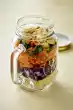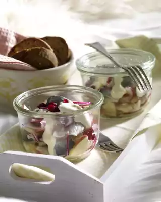 Beat the cream and mustard until thick. Season to taste with salt, pepper and sugar. Layer all ingredients with the sauce and the cranberries in glasses. Herring salad can be prepared well the day before. Then add the sauce separately.