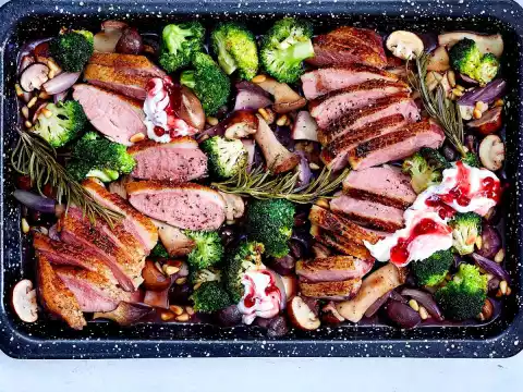 Stir the cranberries until smooth, then fold into the sour cream in streaks. Mix honey and 1 tsp. oil. Spread the duck skin with it about 5 minutes before the end of cooking time. Add mushrooms and pine nuts.