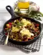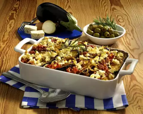 Add olives, onion, garlic and chopped rosemary for the last 3 minutes. Season with salt and pepper. Add the tomatoes and chop them coarsely with a spatula. Put 1 layer of rice, chopped sauce, rice, chopped sauce and aubergines in a greased form (1.8 litres capacity). Crumble the feta cheese and sprinkle over the casserole. Bake in the preheated oven (electric cooker: 200 °C/ convection oven: 175 °C/ gas: level 3) for about 30 minutes. Garnish with rosemary
