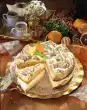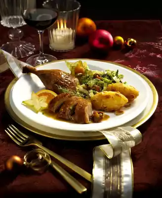 Gradually bake about 28 potato and almond crusts and keep warm. Season the savoy cabbage with salt, pepper and nutmeg. Lift the duck out of the fat pan and pour the stock into a pot. Dissolve the roast with 200 ml water and pour into the stock. Skim off fat. Stir starch and some cold water until smooth, stir into the sauce and bring to the boil. Season to taste with salt and pepper. Carve the duck. Arrange almond crusts and savoy cabbage on plates. Garnish with orange wedges and thyme