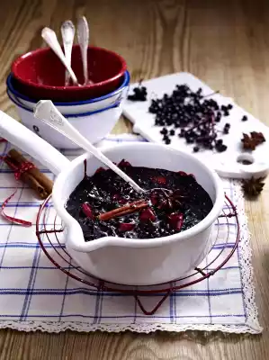 Wash the elderberries, strip them from the stalks, put them in a pot and boil them with 1/4 litre of water, sugar, cinnamon, aniseed and half of the fruit covered for about 20 minutes. After about 10 minutes, add the rest of the fruit and 1/4 litre of water and cook covered for another 10 minutes.