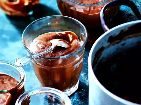 Put chocolate on the hot pudding, let it melt and stir in. Fold in the beaten egg white. Fill the pudding into bowls.