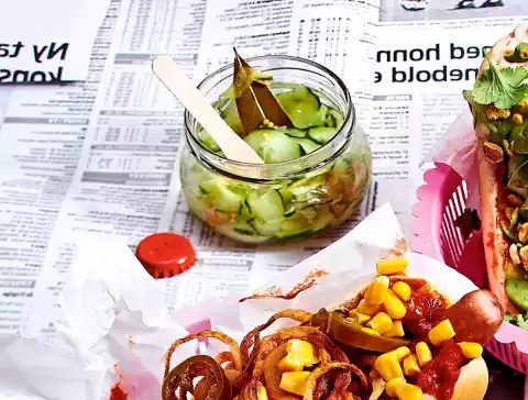 Pour the cucumbers into a sieve, drain well and then pour into the glasses. Pour over with hot stock, close well and let cool down. Keep cold until you eat them.