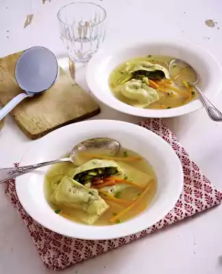 Boil up plenty of salted water. Cook Maultaschen in portions at low heat for about 15 minutes. Peel the carrots, clean and wash the spring onions. Cut both into fine strips. Bring the vegetable stock to the boil in a pot and cook the vegetables for about 3 minutes. Wash the chives, shake dry and cut into small rolls. Arrange Maultaschen in soup plates, pour the hot vegetable stock over them and sprinkle with chives