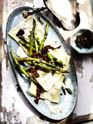 For the ravioli filling, chop 50 g dried tomatoes. Mix tapenade, tomatoes and capers. Quarter the pasta dough and roll out thinly one after the other with the pasta machine. Spread the longish half of the pasta sheet thinly with egg white. Spread the filling with a tablespoon at a distance of about 5 cm on one of the plates. Wrap the remaining half of the pastry sheet on the spread, press it down and cut out ravioli (approx. 5 x 5 cm) with a pastry wheel. Repeat the process with the rest of the dough