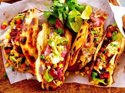 Cut the steak into thin strips. Fill the tortilla flat cake with some lettuce, tomatoes, corn, meat or minced meat. Sprinkle with salad cream and some lime juice as desired. Sprinkle with parsley. Serve the rest of the salad with it.