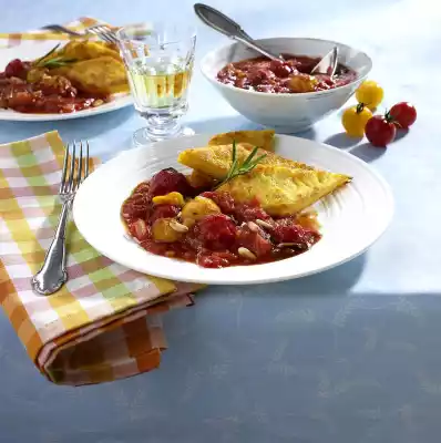 Sprinkle pine nuts over it. Cut the polenta into rhombs. Heat 2 tablespoons of fat in a frying pan and fry the polenta rhombs in it for about 3 minutes on each side until golden brown. Arrange the rhombs with tomato sauce on plates.