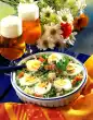 Meanwhile roast the pine nuts in a pan without fat, remove them. Carve tomatoes crosswise, blanch with boiling water, rinse and peel the skin. Cut the tomatoes into pieces. Peel onions and garlic and dice finely.
