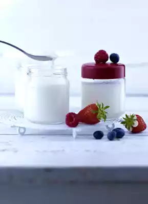 The day before, rinse a measuring cup and the glasses of the yoghurt maker with boiling water. Heat the milk in a pot to 42°C. Take the pot off the stove. Stir the ferment carefully into the milk. Pour the milk mixture into the glasses using the measuring cup.