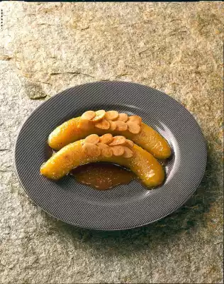 Roast the flaked almonds in a frying pan until golden brown and take them out. Peel the bananas and cut them in half lengthwise. Heat butter and honey in a pan and fry the banana halves in it until golden brown.
