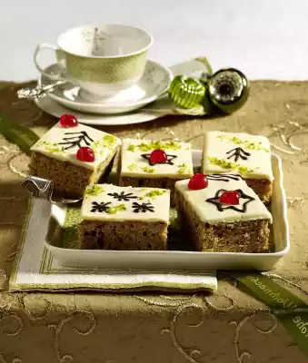 Pour the chocolate coating onto the cake and smooth it down. Let it dry in a cool place. Chop the dark chocolate coating and melt over a warm water bath. Pour into a piping bag. Halve the cherries. Cut cake into pieces and decorate with chocolate, cherries and pistachios. Let dry