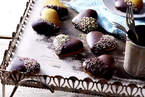 Coarsely chop the couverture, melt with coconut oil over a warm water bath. Coat the hearts completely or half with chocolate coating (dip) and place on baking paper. Decorate as you like with colourful sugar pearls or sugar sprinkles or sprinkle with chocolate sprinkles.