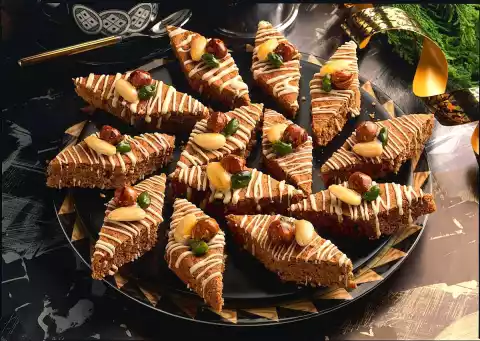 Cut off a small corner and spray strips over the rhombuses. Press an almond, a hazelnut and a pistachio into the moist chocolate. Let the chocolate coating dry. Warm the apricot jam, pass it through a sieve and coat the nuts with it.