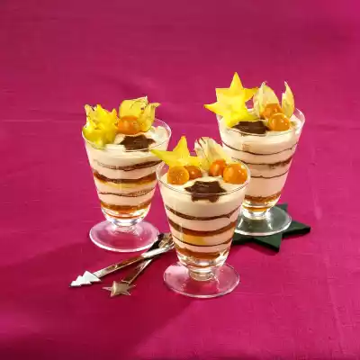Dust the cream with cocoa stars using a stencil or a cookie cutter. Decorate honey cake tiramisu with carambola and physalis