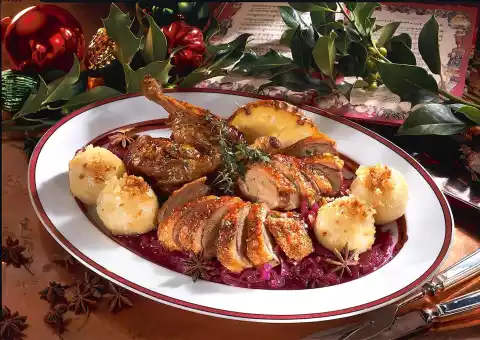 Bring to the boil, cook for about 1 minute. Let it simmer at low heat for about 15 minutes. In the meantime crumble the toast finely. Heat the fat. Roast the toast crumbs in it until golden brown. Sprinkle the dumplings with crumbly butter, serve the duck and red cabbage garnished with pineapple, thyme and star aniseed