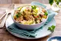 In the meantime peel and halve the onion and cut it into thin strips. Clean and wash the cucumber, cut it in half crosswise and slice it lengthwise into thin slices. Wash dill, shake dry, pluck flags from stems and chop. Halve and squeeze lemon.