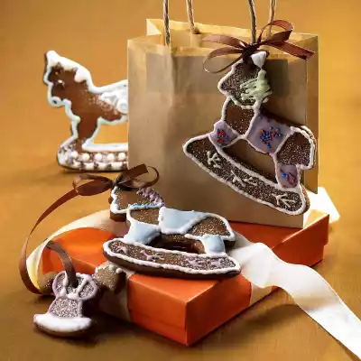 Wrap the dough in foil and let it rest for about 2 hours. Roll out the dough on a floured work surface to a thickness of approx. 1/2 cm and cut out rocking horses (e.g. 10 cm x 8 cm and 4 cm x 6 cm) in different sizes. Place on a baking tray lined with baking paper. Prick openings with a wooden spoon handle to hang them up. Bake in a preheated oven (electric range: 175 ° C/ convection oven: 150 °C/ gas: level 2) for approx. 15 minutes. Let the cookies cool down on a cake rack. In the meantime, stir icing sugar and lemon juice until smooth. Spread the icing on several bowls and colour differently with food colouring. Fill into freezer bags and cut off a small corner each.