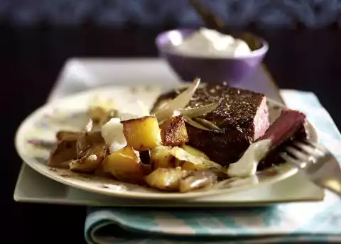 Slice the parmesan into shavings and fold into the potatoes. Arrange steaks and potatoes. Sour cream tastes good with it.