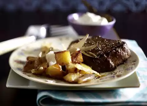Season with pepper. Slice Parmesan cheese into shavings and mix with the potatoes. Arrange steaks and potatoes on plates. Sour cream tastes good with it.