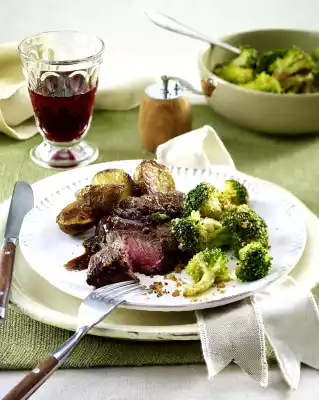 Heat the fat and fry the breadcrumbs briefly in it, season with salt and nutmeg. Add broccoli, toss in and heat. Remove potatoes from the oven. Arrange meat with sauce, potatoes and broccoli.