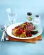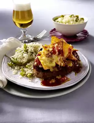 Prepare rice in boiling salted water according to package instructions. Pat the steaks dry. Heat the oil in a pan and fry the steaks on each side. Season with salt and pepper and place in an ovenproof dish. First spread tomato sauce, then chips on top. Sprinkle with cheese. Bake in a preheated oven (electric cooker: 200 °C/ convection oven: 175 °C/ gas: see manufacturer) for 6-8 minutes
