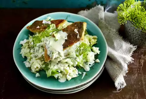 Wash the fish, dab dry, cut into slices. Season fish with salt and turn in flour. Heat 2 tablespoons of oil in a coated frying pan. Fry the fillets for about 6 minutes, turning them over. Bring liquid cream to the boil briefly in a small saucepan.