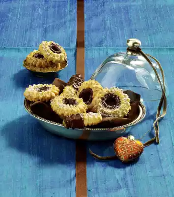 Either put approx. 10 cm long strips, formed directly into circles, or approx. 5 cm long strips on baking trays lined with baking paper. Bake in a preheated oven (electric cooker: 175 °C/ convection oven: 150 °C/ gas: level 2) for 10-12 minutes, let cool down. To decorate, chop the chocolate and melt on a warm water bath. Sprinkle the biscuits with the chocolate and let them dry. Mix icing sugar and cocoa and sieve over the cookies
