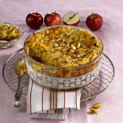 Finish with a layer of bread rolls. Whisk milk, eggs and 50 g sugar. Pour over the casserole dish and bake in a preheated oven (electric range: 175 °C/ convection oven: 150 °C/ gas: level 2) for 35-40 minutes. In the meantime, bring butter, 120 g sugar, cream, flour and almonds to the boil. After about 20 minutes baking time, spread the almond paste on the casserole and bake until done