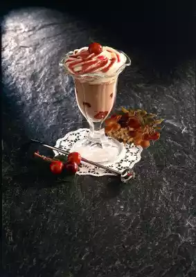 Heat the milk and chocolate chips. Season with cinnamon. Whip cream until stiff. Pour the cherries, except one for decoration, into a heat-resistant glass.