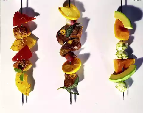 Cut baguette slices in half. Put sausages, onions, tomatoes, cucumbers and bread alternately on skewers. Season with salt and pepper and fry in hot oil while turning for about 10 minutes. Garnish with parsley leaves as desired