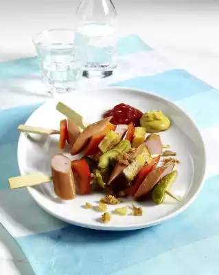 Cut the sausages into pieces. Cut the gherkins in half. Clean, wash and cut the peppers into pieces. Toast bread and cut into pieces. Put everything alternately on 3 wooden skewers. Arrange on plates.