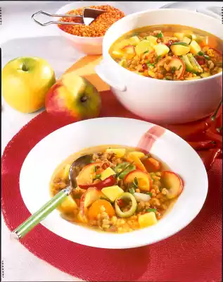 Add potatoes, vegetables and apple juice to the dish lentils and cook for another 15 minutes. Wash and quarter the apple and cut out the core. Cut the apple into thin slices and put them together with the red lentils into the stew. Simmer again for another 10 minutes. Wash the chives, dab dry and cut into fine rolls. Season the finished stew with salt, arrange in a tureen and serve sprinkled with chives
