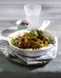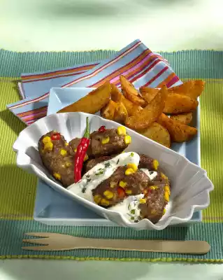 Squeeze the bread well and knead with minced meat, half of the onion, chilli, egg and corn. Season well with salt and pepper. Form minced meat into 5 longish meatballs. Place the meatballs on the other half of the baking tray and bake the remaining 15 minutes. In the meantime, finely dice the gherkin for the tartar sauce. Wash the chives, dab dry and cut into fine rolls. Mix salad cream, yoghurt, remaining onion, chives, gherkin and approx. 1 tablespoon of gherkin stock. Season with salt and pepper. Arrange meatballs, potato wedges and tartar sauce on a plate.