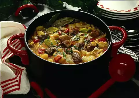 Add paprika. Season with salt, pepper and bay leaves. Deglaze with 2 litres of water. Bring to the boil. Dissolve stock cubes in it. Cook meat for about 1 1/2 hours. In the meantime, clean and wash the cabbage and cut out the stalk. Quarter cabbage and cut into strips. Add to the meat 1/2 hour before the end of the cooking time. Peel, wash and chop the potatoes. Clean and wash the peppers and leek. Dice peppers, cut leek into rings.