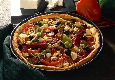 Spread the pizza base with the tomato sauce. Spread the pepper strips, cabanossi, onion rings, pepperoni and olives on top. Put cheese cream in flakes on top. Drizzle everything with olive oil. Bake in the preheated oven (electric cooker: 200 °C/ gas: level 3) for 20-30 minutes.