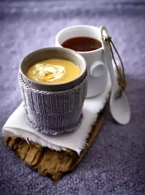 Whip the cream with the whisk of the hand mixer until semi-stiff. Put 250 ml sea buckthorn juice with milk in a saucepan, heat up. Sweeten to taste with honey and pour immediately into 4 cups. Pour cream on top. Drizzle 1/2 tsp. sea buckthorn juice over each and serve immediately