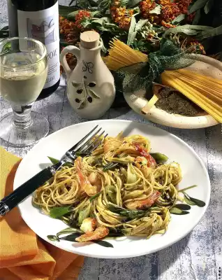 Shrimps, up to the tail end, from the shells loosen and remove the black intestine. Wash the shrimps and pat them dry. Clean, wash and chop the spring onions. Peel garlic and press it through a garlic press. Cook spaghetti in boiling salted water for 8-10 minutes. Fry prawns in 2 tablespoons of hot oil for about 5 minutes. Add garlic.