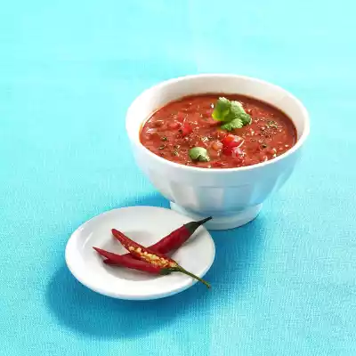 Finely puree the coarsely chopped tomatoes, onion, capers and anchovy with a hand blender. Season to taste with salt, pepper and a little sugar. Fold in the rest of the chilli and tomato. Season with ground coriander. Arrange in a bowl, sprinkle with coarse pepper and garnish with coriander leaves