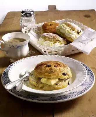 Add yeast milk and knead with the dough hooks of the hand mixer for 3-4 minutes to a smooth yeast dough. Finally add currants and knead. Cover the dough and let it rise in a warm place for 45-60 minutes. Knead the dough again lightly (!!) on a floured work surface and roll it out 2-3 cm thick with a dough roller or press it flat. Use a glass or a round cookie cutter (7-8 cm Ø) to cut out about 16 round rolls and place them on two baking trays lined with baking paper. Cover and leave to rise in a warm place for another 20-30 minutes. Mix egg yolk and cream and brush the rolls with it. Bake one after the other in a preheated oven, 2nd shelf from below (electric oven: 200 °C/ convection oven: 175 °C/ gas: level 3) for about 20 minutes. Put warm hot rolls in a deep plate, cut off a lid and put a piece of butter on the lower half.