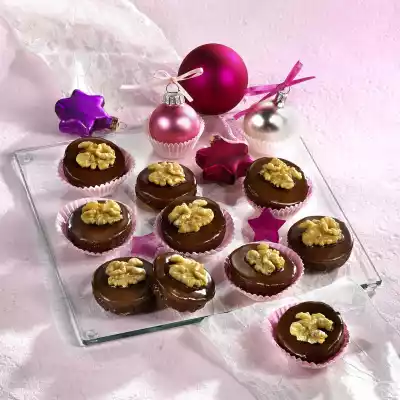 Repeat the process with the second half of the dough. Knead the marzipan and roll out thinly between 2 layers of foil. Cut out round taler the size of the cookies. In the meantime, let the chocolate icing soften in a hot water bath. Spread the top of the biscuits thickly with currant jelly, place a marzipan taler on top and press carefully. Dip the marzipan side into the dissolved chocolate icing and cover with 1/2 walnut. Allow to dry completely before serving