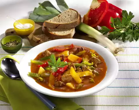 In the meantime clean, wash and cut the peppers into strips. Peel, wash and chop the potatoes. After about 1 hour add paprika and potatoes. Season soup with salt, pepper and paprika. Garnish with parsley. Serve with 1/2 slice of mixed bread per person